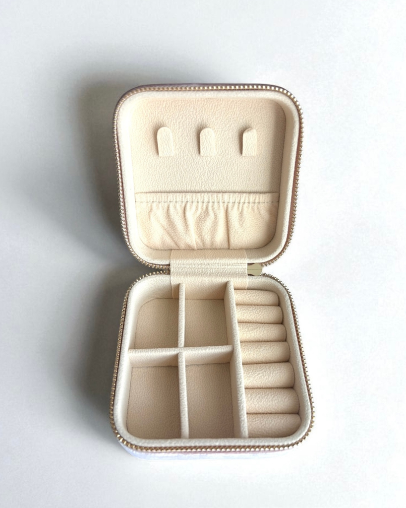 - A square travel jewelry case in light green velvet with BIRDS embroidered