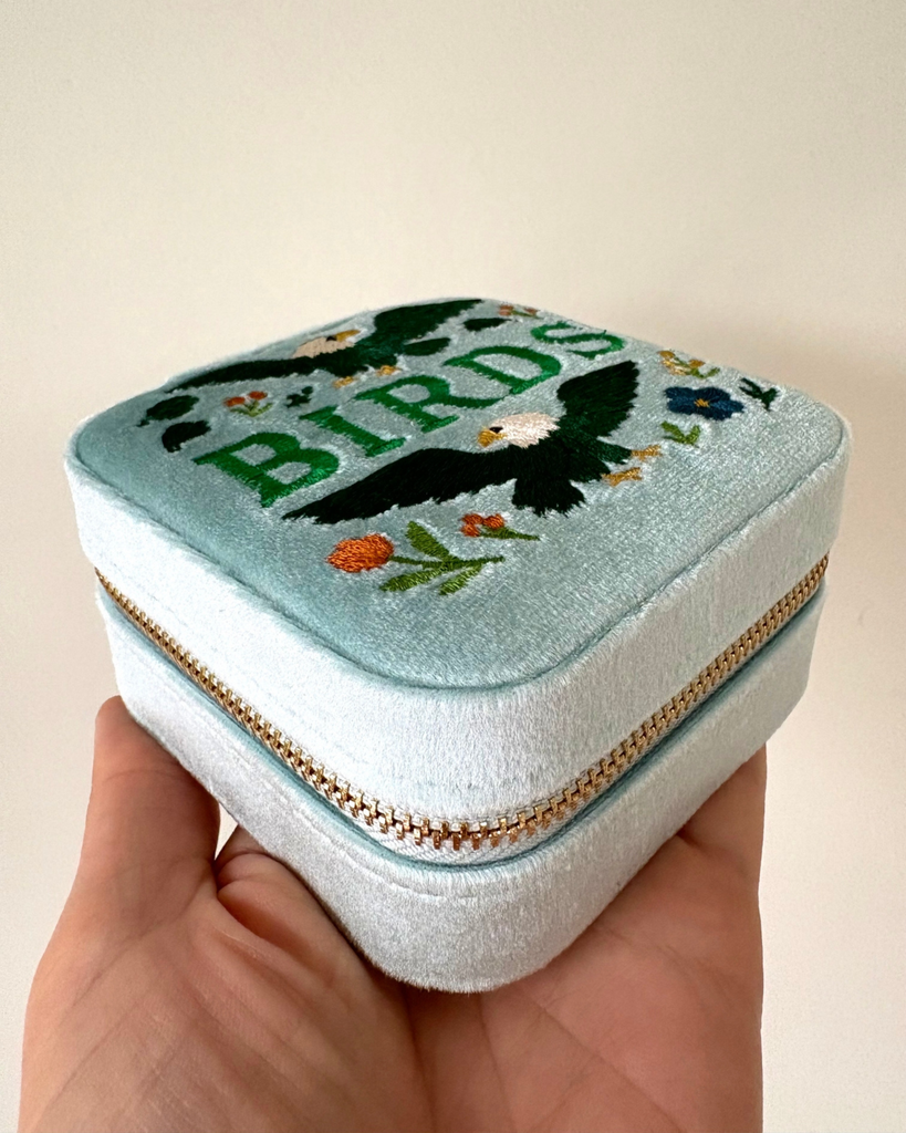Calling all birds fans! This velvet jewelry box features BIRDS embroidered with colorful floral accents. Compact and travel-friendly, it has slots and compartments to store rings, earrings, and everyday favorites. Perfect for gifting to an Eagles fan or treating yourself— go birds!