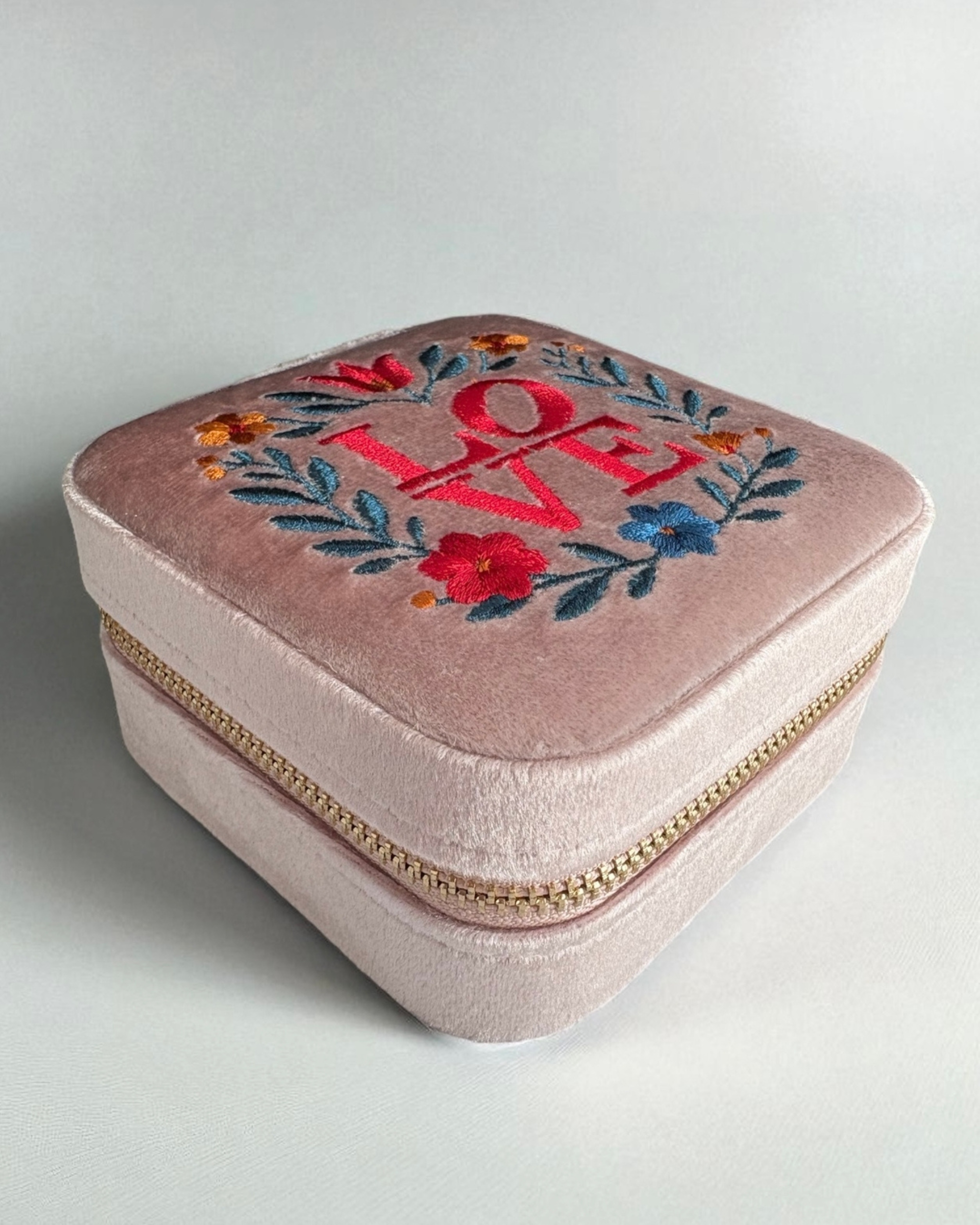 - A square travel jewelry case in blush velvet with 'LOVE' embroidered