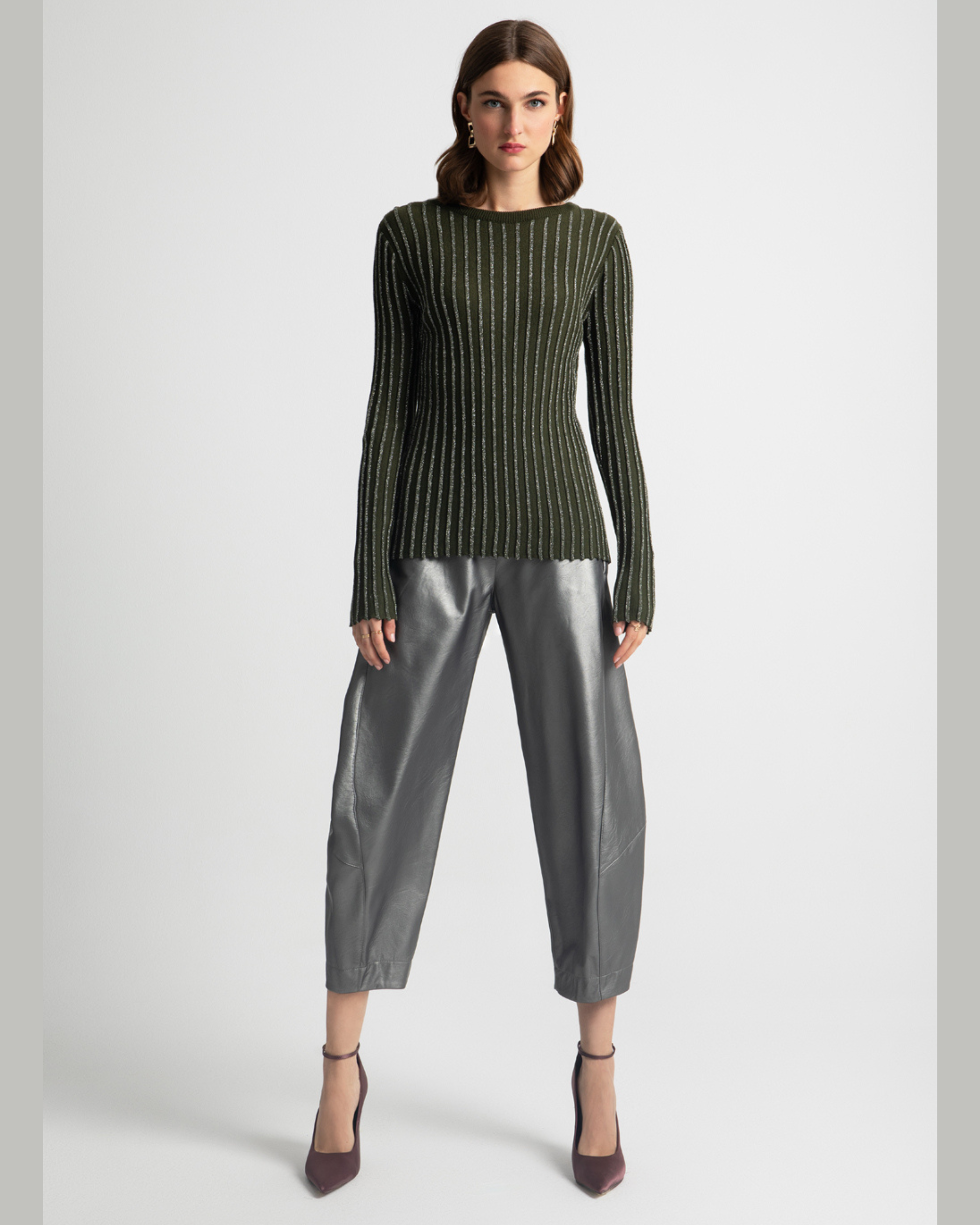 • Gunmetal vegan leather barrel pant