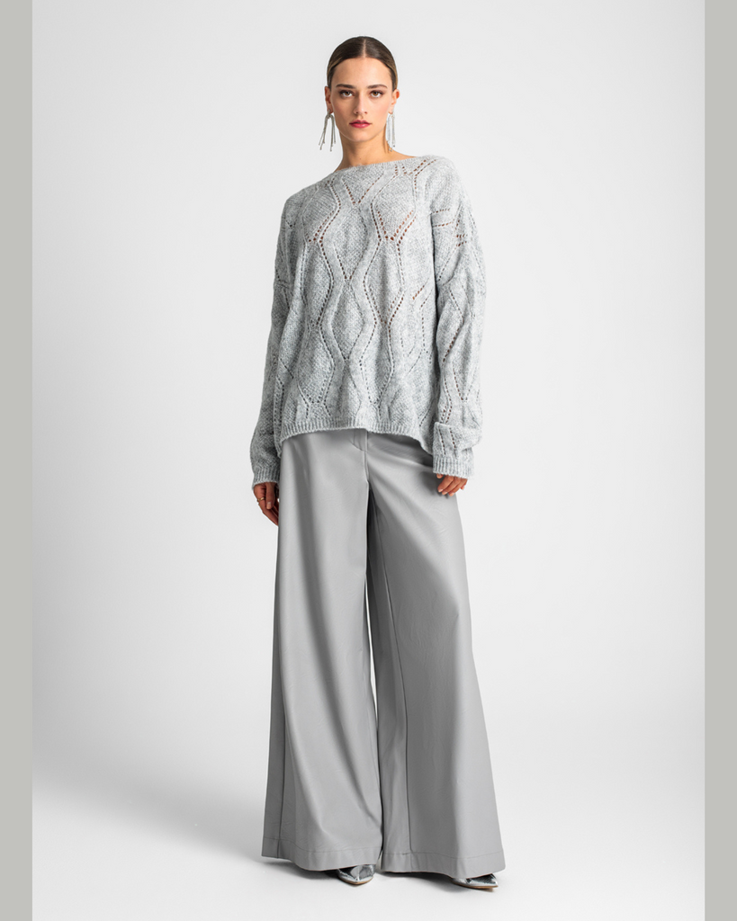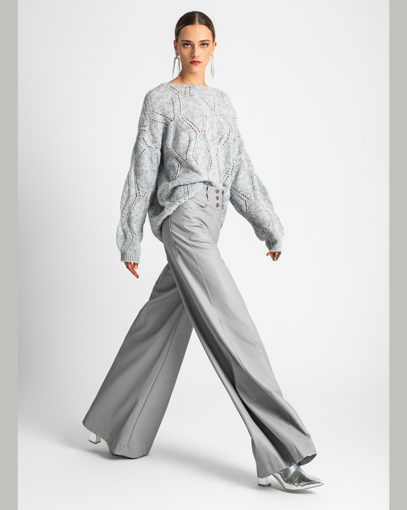 Cozy knit sweaters and sweater dresses, cold shoulder shirts and color-blocked coats in a palette of steely grey's make up the contemporary cool line of apparel by Greek fashion label, Moutaki.