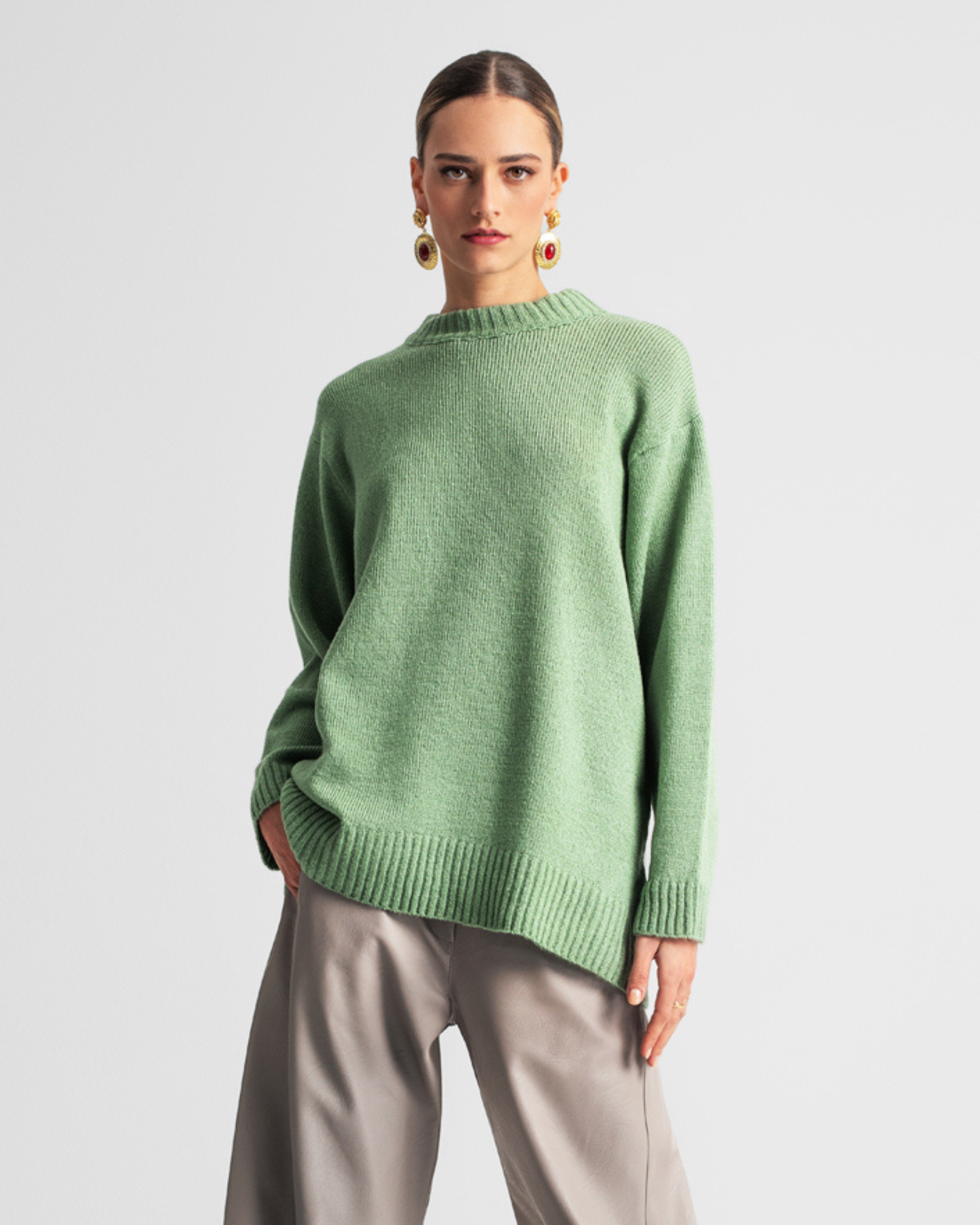 Cozy knit sweaters and sweater dresses, cold shoulder shirts and color-blocked coats in a palette of steely grey's make up the contemporary cool line of apparel by Greek fashion label, Moutaki.
